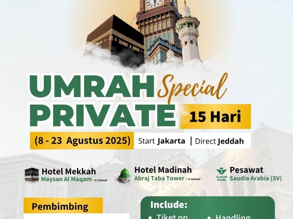 - Perlengkapan : Koper kabin, koper bagasi, tas paspor, kain ihram/mukena, sandal, buku manasik, kain seragam, syal, & sabuk